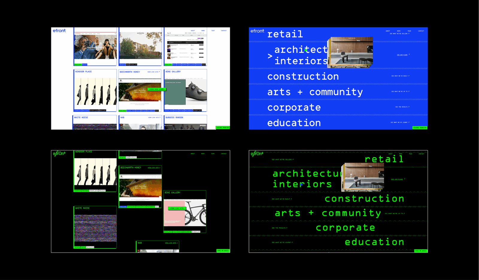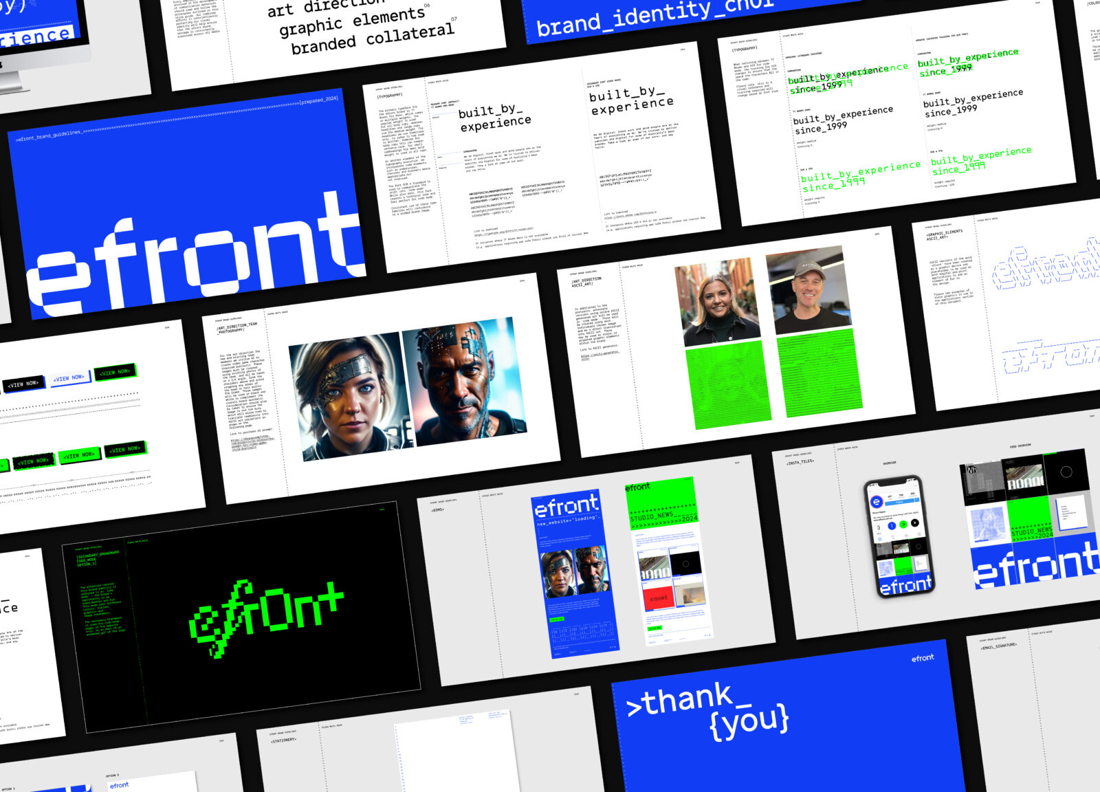 The objective was to refresh efront’s brand identity and online presence to better reflect the calibre of their work and appeal to a broader, design-conscious client base. As a team deeply embedded in code and systems, they needed a brand that could signal technical credibility while expressing their personality — confident, curious, and collaborative.