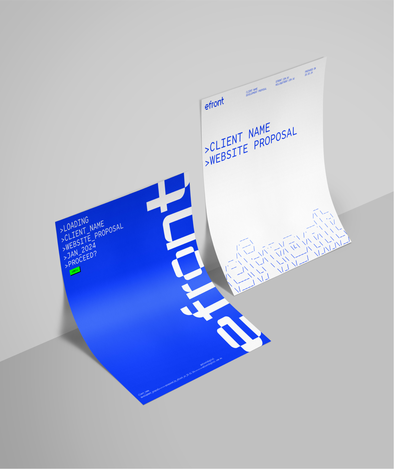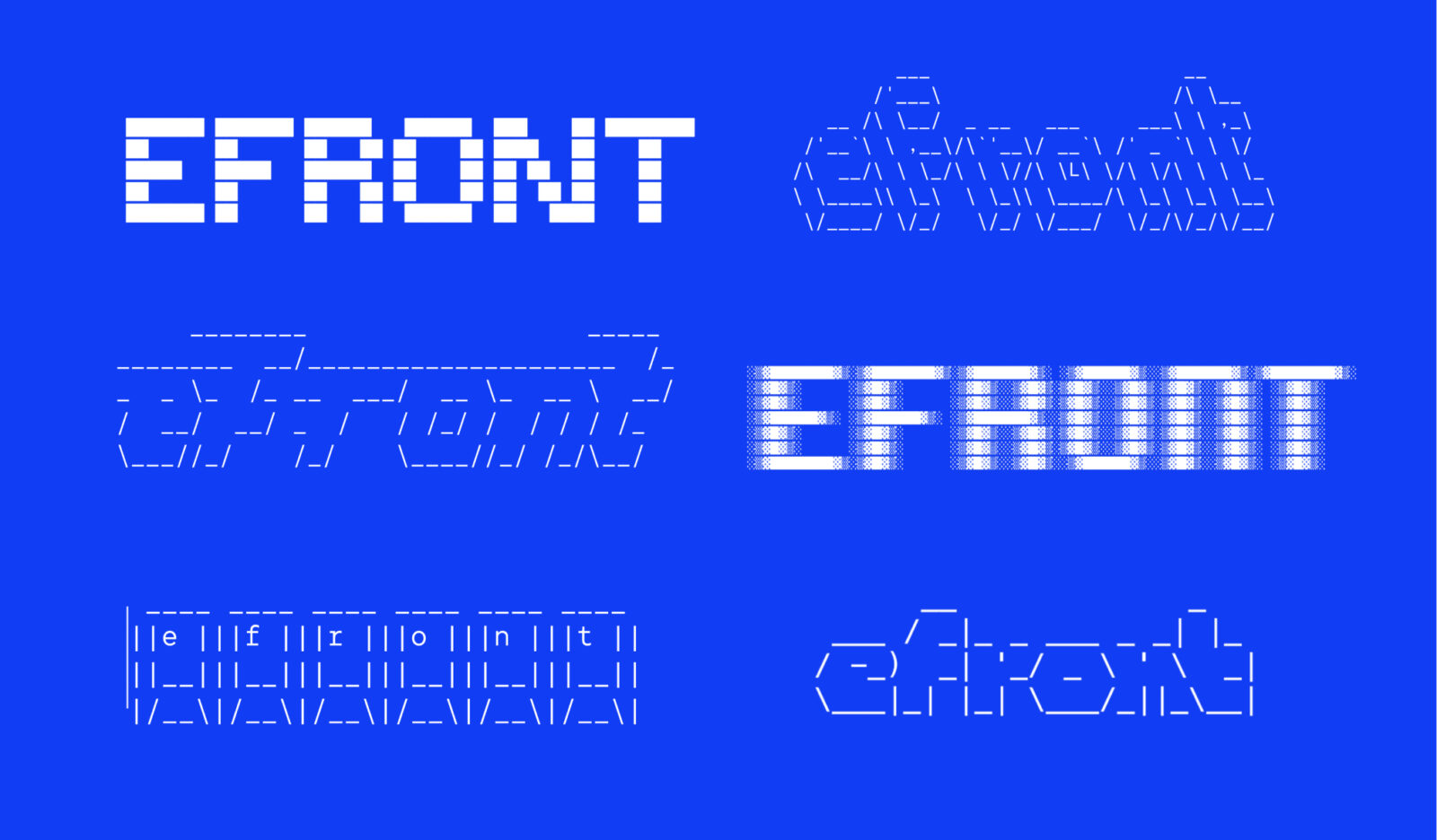 Rooted in the language of code, the brand identity fuses ASCII art, bold monospaced type, and a stripped-back palette to speak directly to developers and designers alike. At its centre sits the custom website — a layered, interactive experience built to showcase efront’s capabilities through structure, storytelling, and playful experimentation.