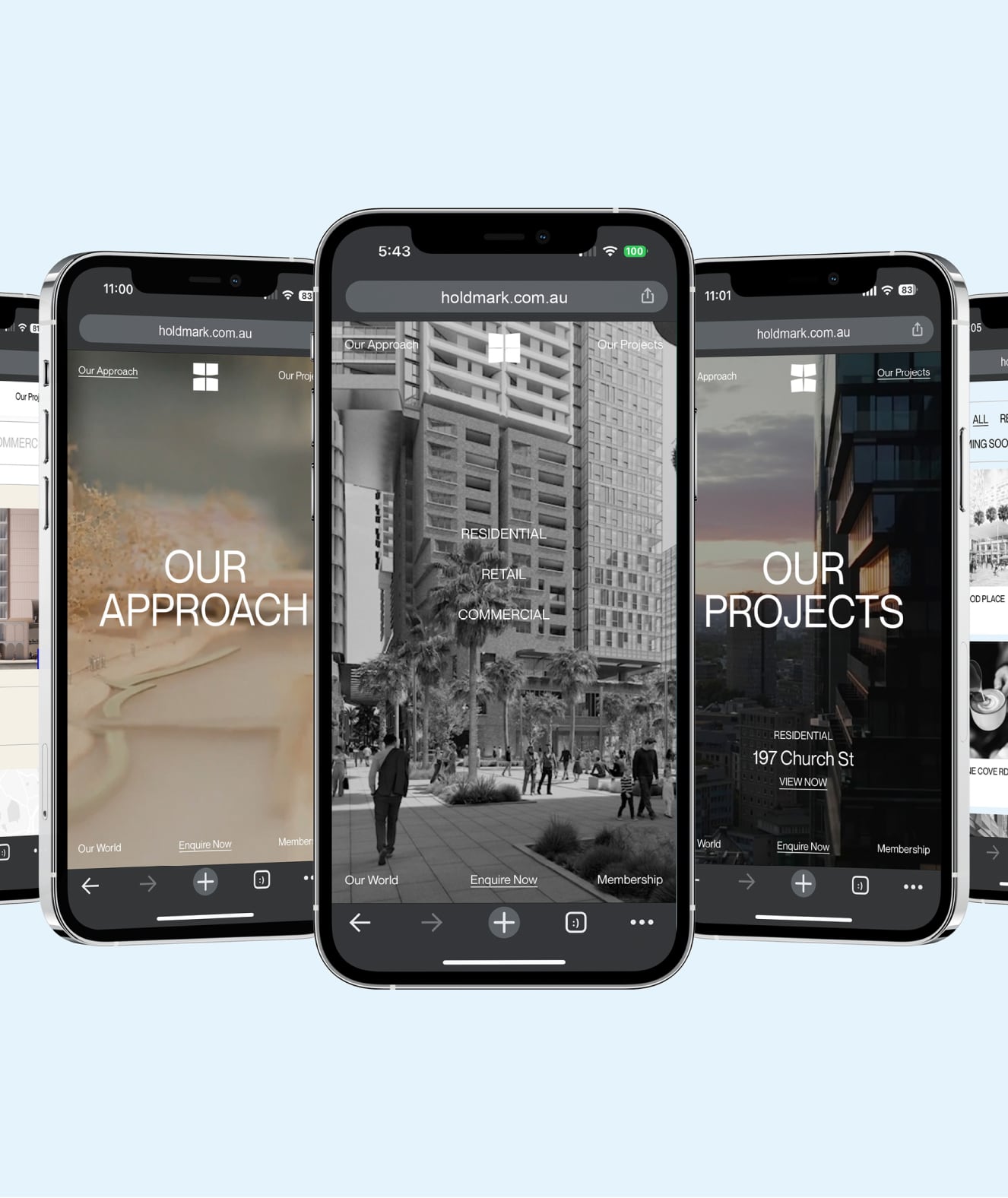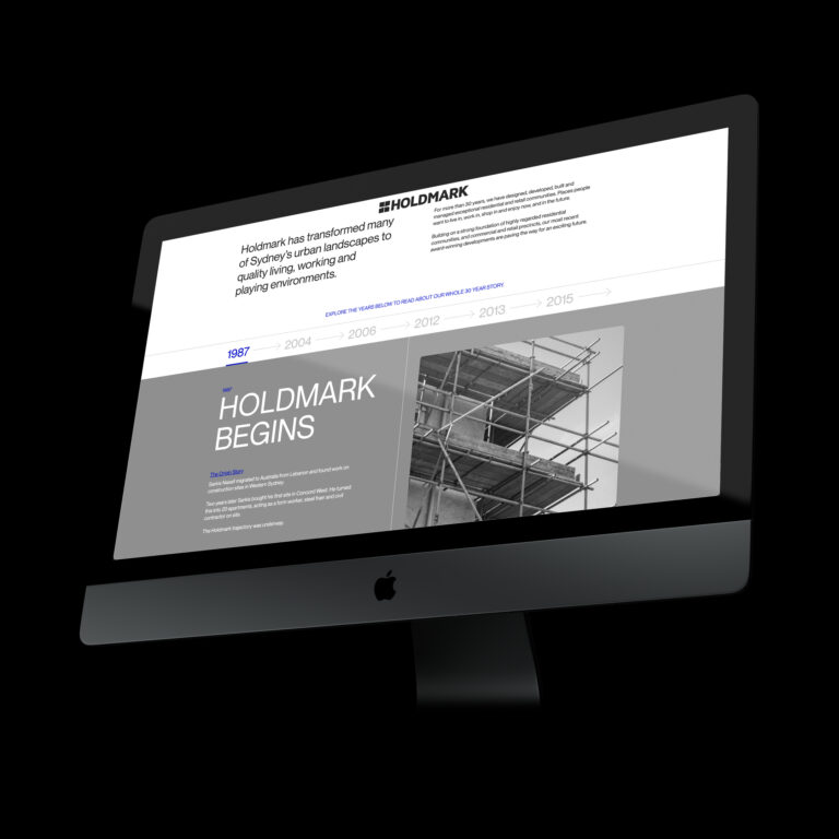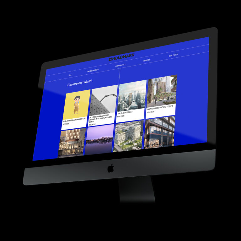 We created an unconventional yet user-friendly website, featuring a menu on each corner of the screen, inspired by the Holdmark logo. Video and footage were utilised as headers for each main page, resulting in a more engaging user experience. The website’s accent colour, cobalt blue, adds energy to the design, and interactive elements such as an animating logo, interactive colour changes, and movement in website modules were incorporated to enhance user interactivity.
