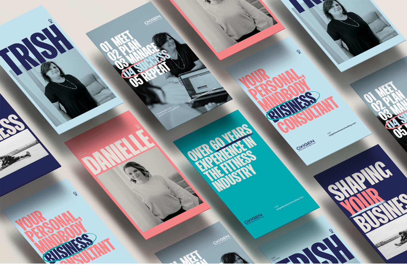 Oxigen Business Consulting was founded with one mission in mind – to help fitness business owners succeed. With 60+ years of collective industry experience, they know exactly what it takes to run a successful fitness business in a competitive market. By using a bold typographic approach to showcase their strong messaging, paired with a playful colour palette and hand drawn annotations, we created an engaging brand that reflects their confidence in the industry.