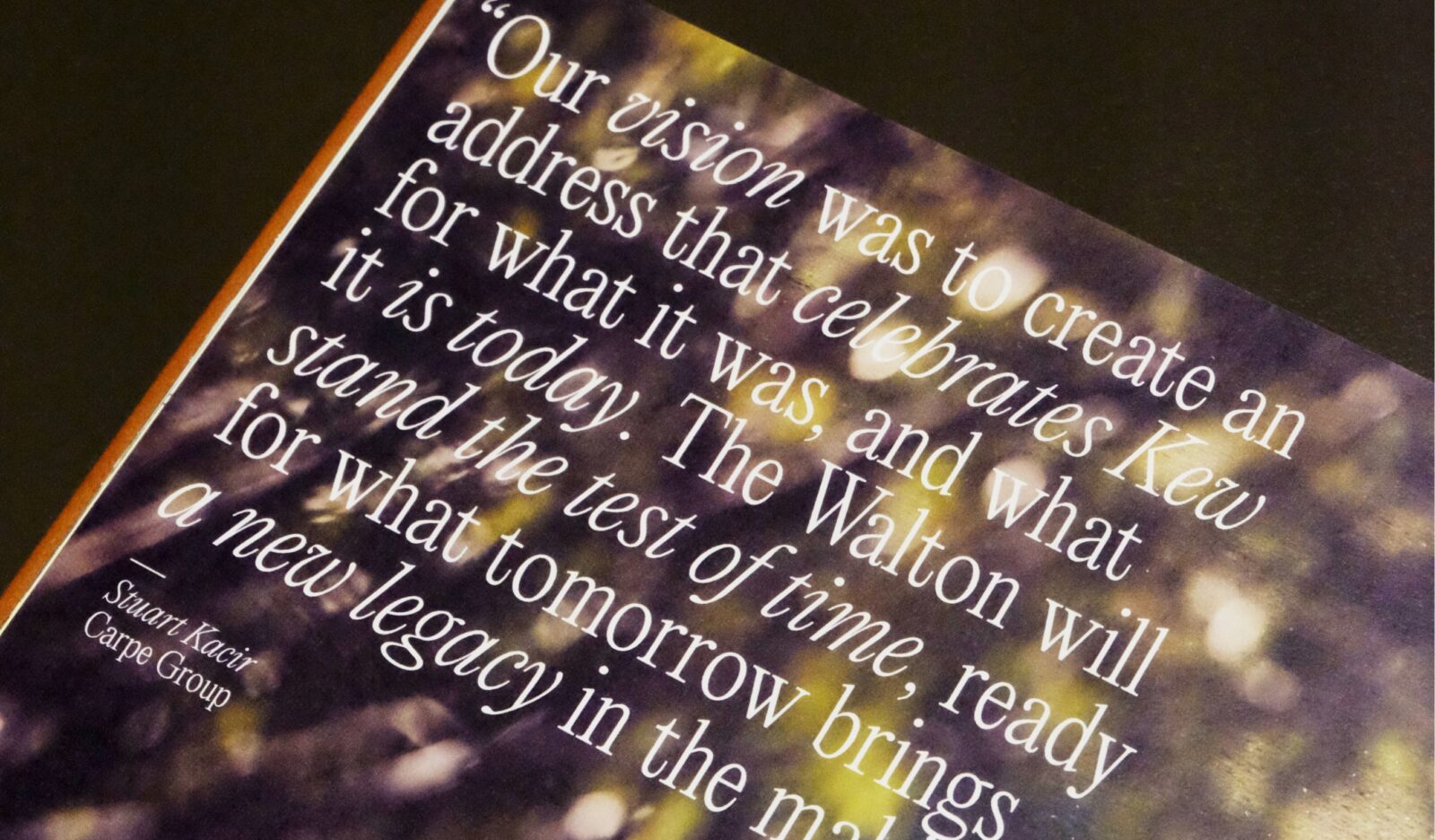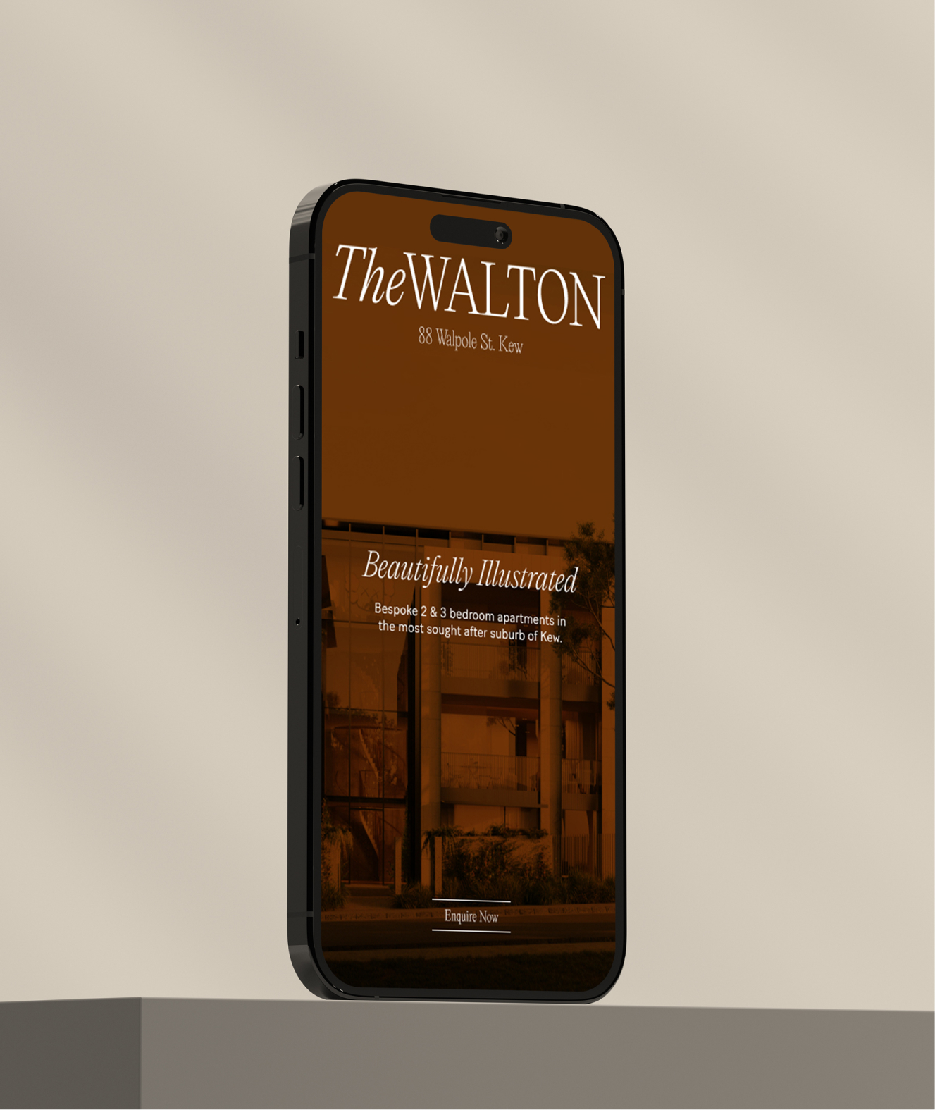 We created the name The Walton as an expression of the two streets that form this iconic corner address — Walpole Street and Eglinton Street. Inspired by the architecture, location and the generously sized apartments, our refined brand expression combined an elegant identity with hand drawn illustrations and natural textures. These elements form a sophisticated brand that celebrated the lifestyle The Walton has to offer.